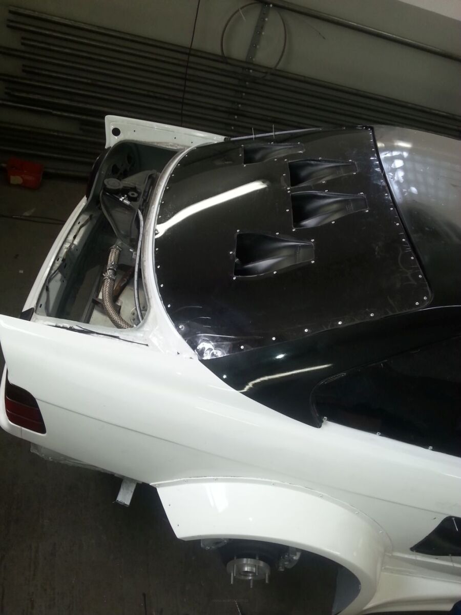 Aby uzyskać lepszy rozkład masy samochodu i dodatkowo pozyskać miejsce pod maską na duże chłodnice oleju silnika i oleju wspomagania, zdecydowaliśmy się przenieść chłodnicę wody do bagażnika, dokonaliśmy analizy wolnej przestrzeni również uwzględniliśmy możliwości doprowadzenia dużej ilości świeżego powietrza i wybór padł na potężną chłodnicę wody Nissens z rdzeniem grubości 52mm. Chłodnica wypełnia całą wolną przestrzeń i ulokowana jest w neutralnym miejscu. Wykonaliśmy zabudowę chłodnicy wewnętrzną która odgradza kabinę kierowcy i pasażera od chłodnicy i zbiornika paliwa. Powietrze kierowane jest wlotami NACA Duct które umieściliśmy w poliwęglanowych szybach oraz dodatkowo w błotnikach.
