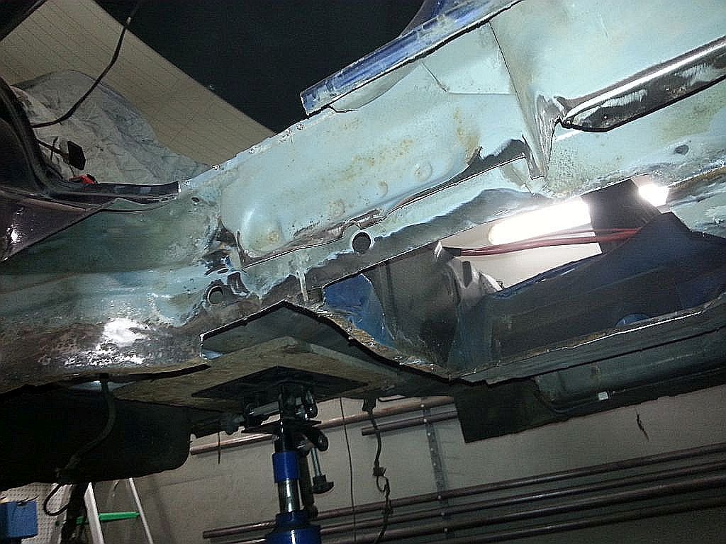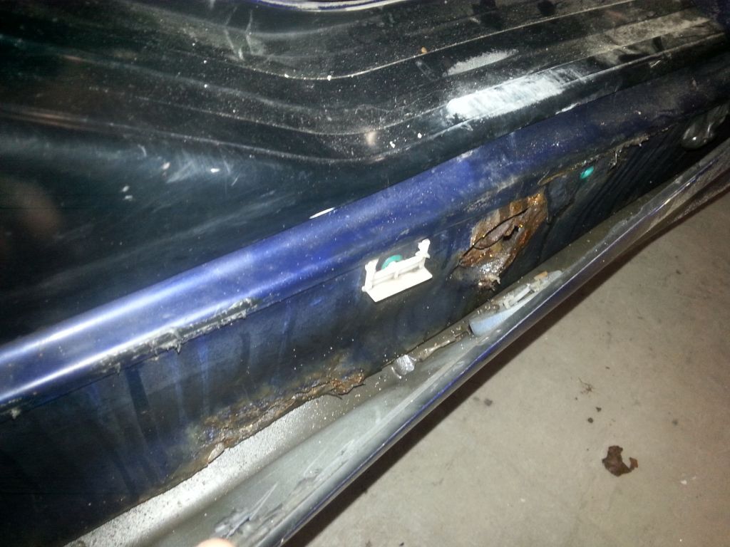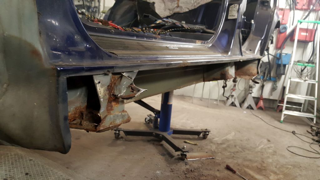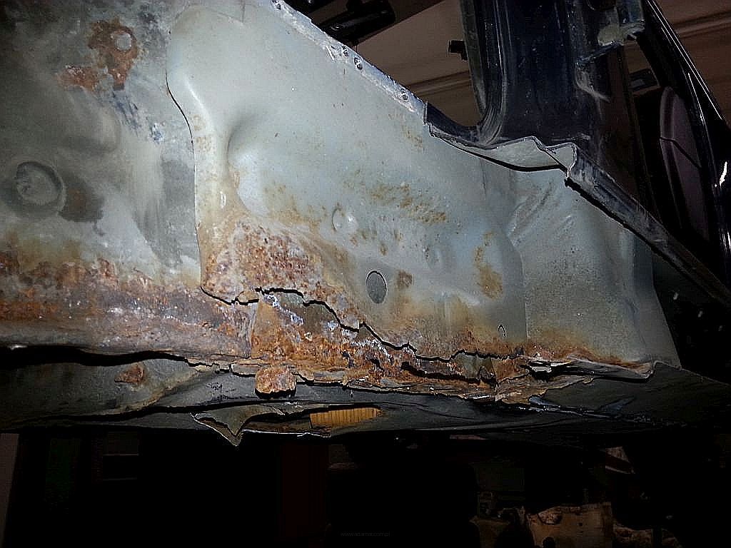 Taki widok nie napawa optymizmem, skorodowane progi, praktycznie nie istniejące mocowanie lewarków, ale przy odrobinie zapału wszystko da się naprawić. W tym miejscu dla posiadaczy marki BMW chciałbym udzielić jednej prostej wskazówki aby uniknąć w przyszłości takiego stanu blacharskiego. Otóż za tak rozległą korozję odpowiedzialne są otwory w progu w których mocowane są plastykowe stopy dla podnośników samochodowych. Otóż dopóki są one na swoim miejscu, woda nie dostaje się do środka progów. W większości jednak egzemplarzy z którymi się stykam tych mocowań już nie ma, i to właśnie przez te otwory montażowe po tych stopach dostaje się woda do środka, a jak dobrze wiecie ona jest wrogiem stali. Warto również zwrócić uwagę na wszelkie zaślepki w podłodze, które zwłaszcza w przypadku mocno obniżonych BMW są najczęściej wduszone i przez ich otwory montażowe w podłodze dostaje się woda pod dywanik. Tak właśnie było też i w tym egzemplarzu.