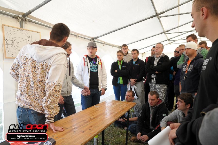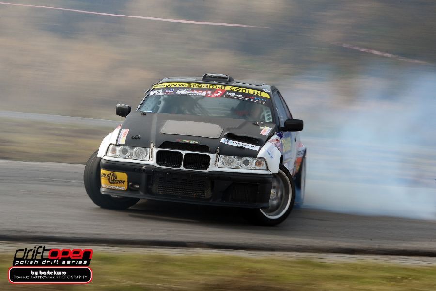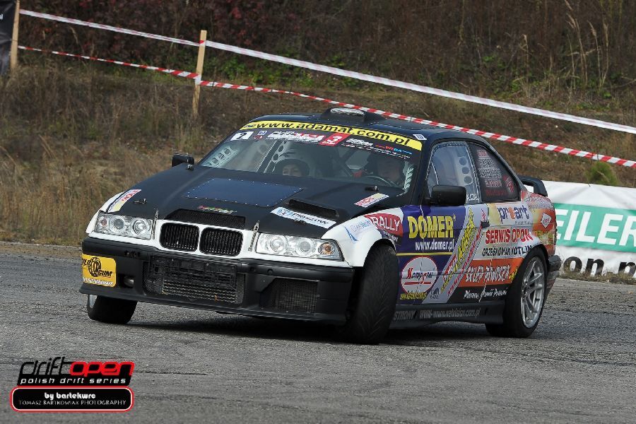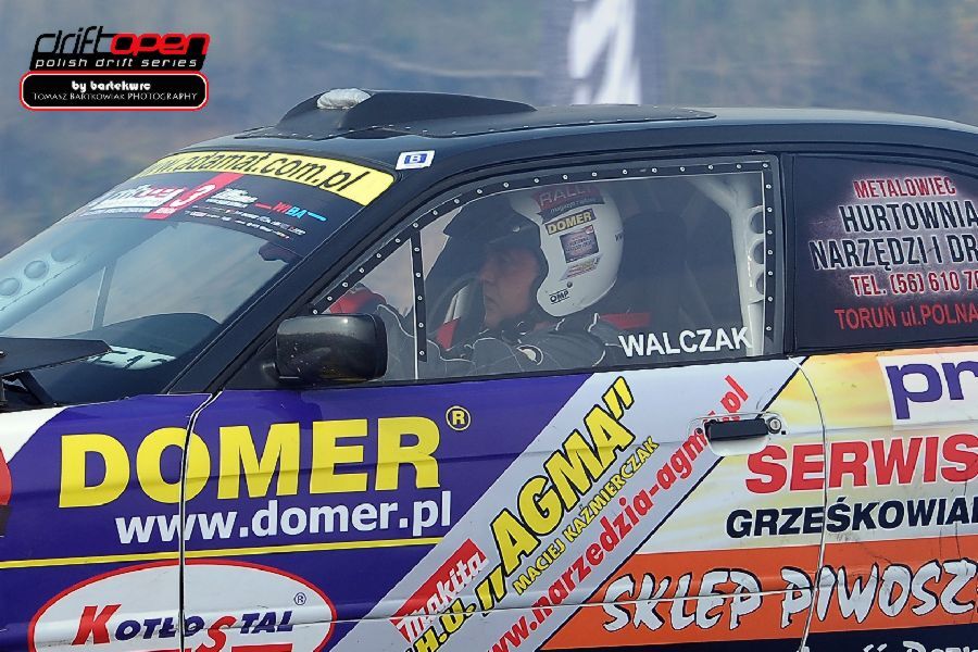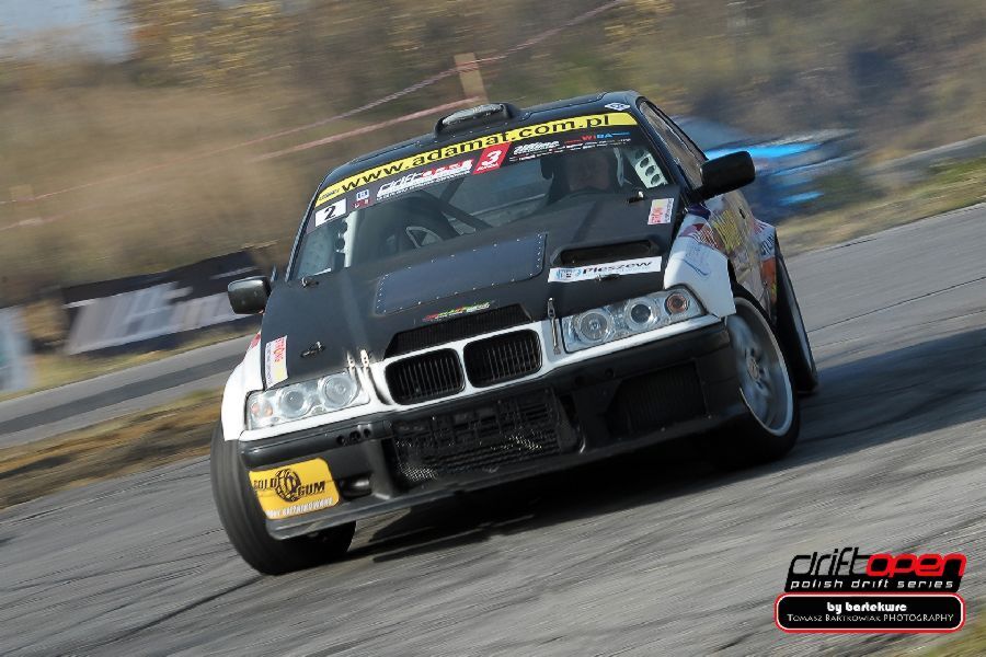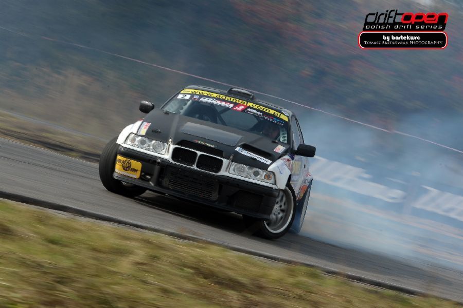 Przygotowania do finałowej rundy Drift Open w Wyrazowie, trwały praktycznie od treningu w Toruniu. Sezon od początku był dla nas niezbyt udany. 1 Runda w Toruniu zakończyła się wynikiem 3 razy 0, potem awarie sprzęgła wyeliminowały nas z rywalizacji podczas 2 rundy w Koszalinie. Problemy budżetowe w tym sezonie nie pozwoliły nam na intensywne treningi. Większość budżetu pochłonęły naprawy i modyfikacje sprzęgła. A od rundy w Toruniu, dopiero 13 września zaliczyliśmy jedyny bardzo udany trening. Wreszcie nadszedł czas na finałową rundę Driftingowego Pucharu Polski. Samochód mechanicznie przejrzany i sprawny, opony na przedniej osi praktycznie już slick i wystające druty, na napęd coś się uzbierało z przydomowego zapasu śmietników, które już kompletnie nie nadają się do codziennej jazdy, a o rywalizacji w zawodach nie wspomnę. Ale ostateczna decyzja… JEDZIEMY!!! Keep Drifting Fun!!! Od początku właśnie to hasło towarzyszyło naszej wyprawie. Szanse na awans do TOP32 i awans do Mistrzostw Polski były praktycznie niewielkie. Nasze główne założenie to „dobrze się bawić i gaz do dechy”!!! Gdy poznacie ekipę organizatorów DRIFT OPEN i zawodników, którzy na te rundy przyjeżdżają, to zrozumiecie, dlaczego wszyscy kochają drifting. I wreszcie sobota, 3 rano pobudka i jedziemy, na torze zjawiliśmy się tuż po godzinie 8. Rozkładanie stanowiska, drobne kosmetyczne zabiegi przy aucie i zaczyna się. Na briefingu sędziowie Mantas Kuzmarkis, David Kalas oraz wspierający ich Michał Głębowski wyjaśnili zawodnikom, jakiej jazdy od nas oczekują, gdzie są clipping zony i clipping point. Jednym słowem sędziowie wymagali jak zawsze jazdy na wklepanym i słynnego odcięcia silników!!! Na linii startu pojawiło się prawie 80 zawodników, a średnia moc samochodów przekraczała 400KM. Ponieważ zawody Drift Open są rozgrywane w cyklu otwartym, toteż na starcie pojawiło się wielu zawodników regularnie startujących w Mistrzostwach Polski. Poziom zawodników był bardzo wysoki, praktycznie w tym sezonie nie widziałem jeszcze tak wyrównanej walki. Myślę, że ten poziom sprawiał również kłopoty sędziom. W pierwszej sesji treningowej jeździłem bardzo dobrze, nie popełniałem zbyt wielu błędów. Jedyny problem z jakim walczyłem przez cały dzień to utrudnione szybkie przekładanie biegów głównie z 2 na 3, po prostu czasami zamiast biegu trzeciego wbijałem jedynkę i przejazd był zmarnowany. Przejazd trasy wymagał opracowania strategii, a każdy zawodnik miał swoją. W drugiej sesji treningowej chyba nerwy lekko dawały znać o sobie, popełniałem sporo błędów i często spinowałem. W końcu przyszedł czas na kwalifikacje. Nr startowy 2 więc praktycznie bez czekania zaczynam swoje przejazdy. Najpierw przejazd rozgrzewkowy i znów problemy z biegami, ale uśmiech na twarzy, klika żartów z sędzią flagowym na starcie i w końcu magiczne słowa „Number 2 – first run” no i „Let’s Rock and Roll” gaz w podłogę i jazda. Przejazd nie do końca czysty, ale punktowany wynik 59/100, kolejny przejazd, jedziemy już ostro i niesamowity banan na mojej twarzy, wynik 77/100, w końcu trzeci przejazd, a ponieważ wcześniejsze przejazdy jechałem zachowawczo nadszedł czas na jazdę na 100%. Pierwszy zakręt i strefa idealnie duży kąt, spora prędkość na nawrocie praktycznie każdy zawodnik używał ręcznego, niestety ja musiałem zamiast ręcznego zmieniać bieg z 3 na 2 następnie gaz w dechę oj oj oj za szeroko za szeroko oj i zahaczyłem pobocze w lusterku widzę w powietrzu unoszący się piach, ale cisnę dalej przekładka na 3 bieg "zapięty uff" i wklepane w podłogę strefa zebrana perfekcyjnie… wynik 69 - niestety błąd, złapane pobocze które nie zmieniło mojego toru jazdy ale jednak błąd wszyscy to widzieli. Mój najlepszy wynik to 77/100 pkt i on jest brany pod uwagę. Jest duża szansa na awans do TOP32. Ubrany już na luzaka podziwiam kwalifikacje pozostałych zawodników, poziom bardzo wysoki, wszyscy zawodnicy bardzo doświadczeni, wszyscy popełniali minimalne błędy. W godzinach wieczornych ogłoszenie wyników. Sędziowie w pierwszej kolejności ogłaszają najlepszy wynik kwalifikacji, który należał do dwóch fantastycznych kierowców PUZ Drift Team Marcina Mospinka i zwycięzcy 7 rundy King of Europe na torze Hungaroring Grzegorza Hypkiego, ich wynik identyczny to 88/100pkt. I w końcu decydujący komunikat… minimalna ilość punktów, aby awansować do TOP32 to… 78/100… WOW!! Wielkie gratulacje dla zawodników. Wielkim zaszczytem jest walczyć z najlepszymi!!! Mimo braku tego magicznego punkcika i tak wracałem do domu bardzo zadowolony. Mimo wielu przeciwności w tym sezonie i braku treningów wynik pokazuje jednak, że jadę właściwym torem... A ja już znam nieoficjalne plany organizatorów Drift Open na przyszły sezon 2014!!! Będzie grubo!!!