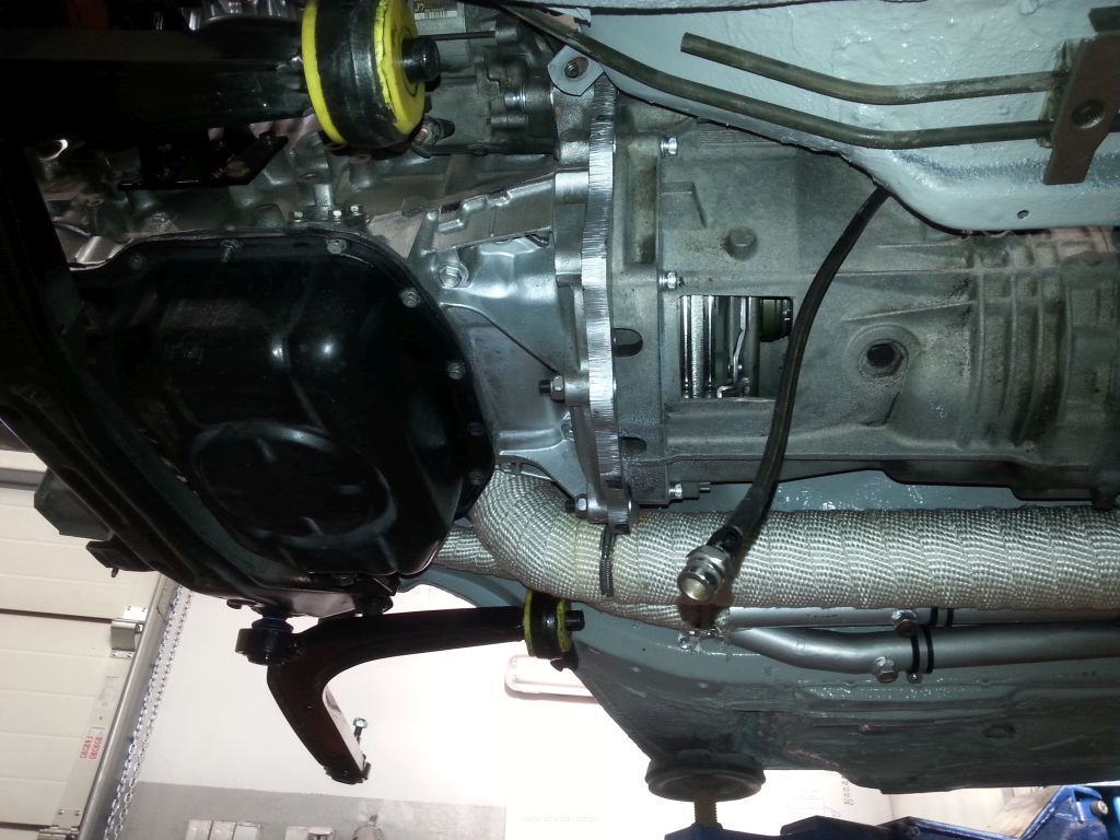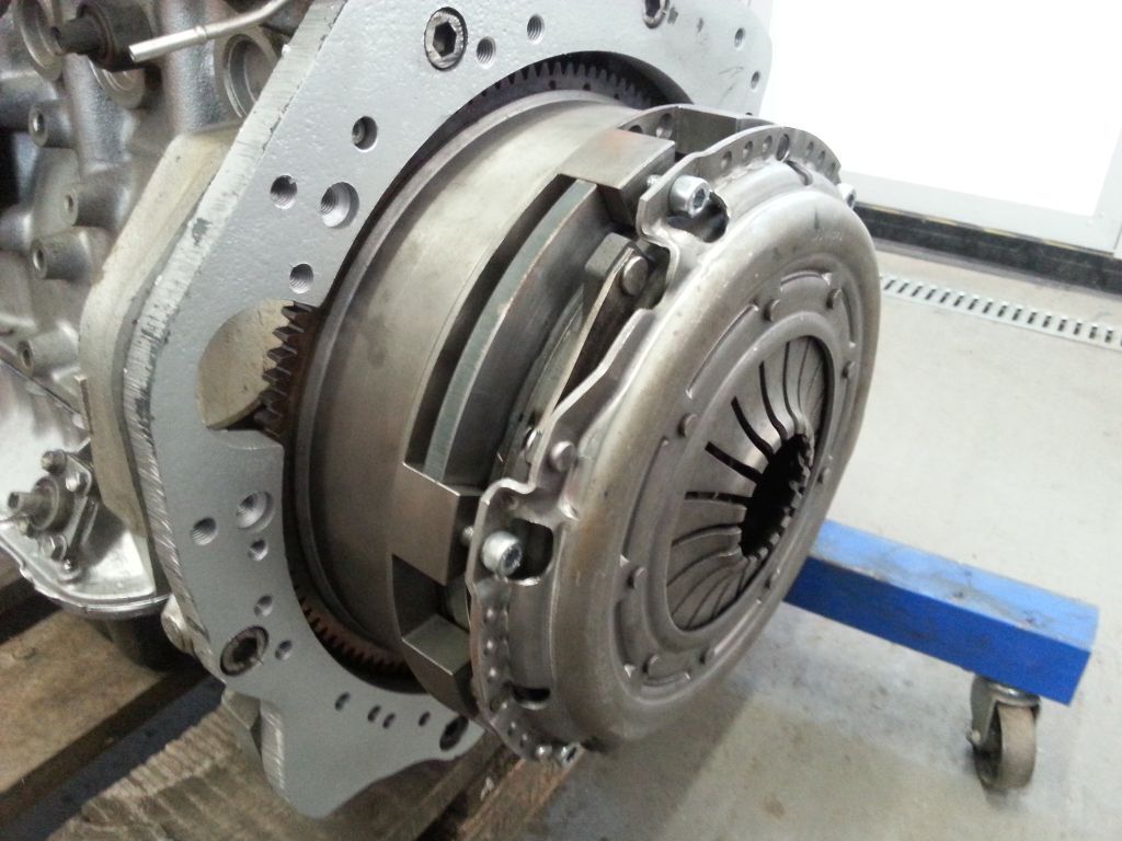 Silnik połączony jest ze skrzynią biegów BMW M57 z zastosowaniem naszego adaptera. Jest to najmocniejsza skrzynia BMW gwarantująca przeniesienie momentu obrotowego do okolic 1400Nm. Wykonaliśmy od podstaw cały zestaw dwutarczowego sprzęgła z customoym kołem zamachowym, o przeniesienie momentu zadba docisk Sachs Racing. Dwie kevlarowe tarcze sprzęgła zdołają przenieść 1100Nm momentu obrotowego.