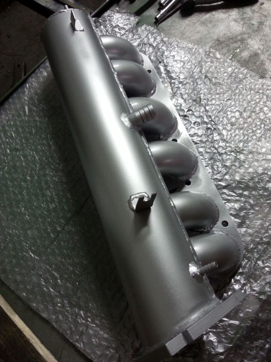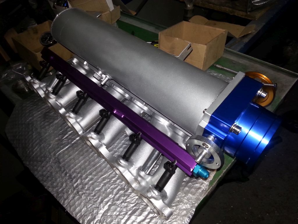 W dalszym etapie zdecydowaliśmy się na budowę własnego kolektora dolotowego współpracującego z 80mm przepustnicą. Kolektor posiada główną komorę ciśnieniową w której kumulują się wszystkie zawirowania strugi powietrza, z komory powietrze trafia kierowanymi kanałami bezpośrednio do poszczególnych cylindrów. Takie rozwiązanie zapewni nam jednakową ilość powietrza w cylindrach, co jest bardzo ważne w wysilonych silnikach turbo. Najczęściej na rynku dostępne są uproszczone wersje kolektorów z bezpośrednim dolotem powietrza z przepustnicy, takie rozwiązania sprawiają że największa ilość powietrza z reguły dostarczana jest do ostatniego cylindra co ma ogromny wpływ na wzrost temperatury w tym cylindrze i jego uszkodzenia. Dolna część kolektora została zmodyfikowana pod nowe wtryskiwacze SIEMENS DEKA, które osadziliśmy w nowej listwie paliwowej.