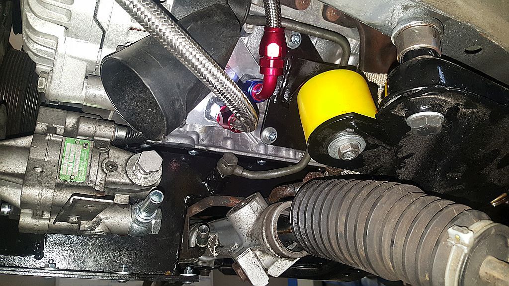 Przy swapie zastosowane jest nasze rozwiązanie miski olejowej z odwróconą pompą. Silnik mieści się idealnie w komorze, układ chłodzenia oparty jest na chłodnicy oraz wiatraku z silnika 2.5TDS. Do budowy układu smarowania wykorzystaliśmy oferowany przez nas zestaw do relokacji filtra. Ułątwia to bardzo montaż filtra oleju w miejscu wygodnym dla nas.